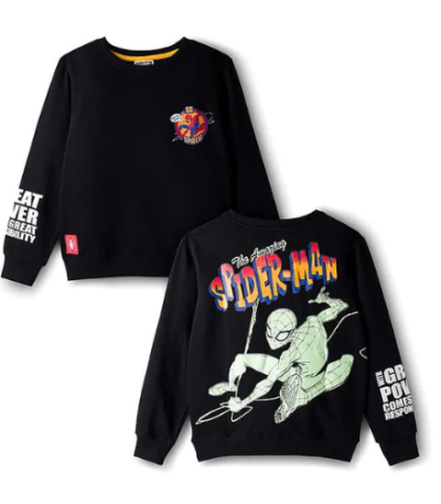 Pine Kids Marvel Terry Knit Full Sleeves Sweatshirt With Front and Back Spider-Man Graphics – Black